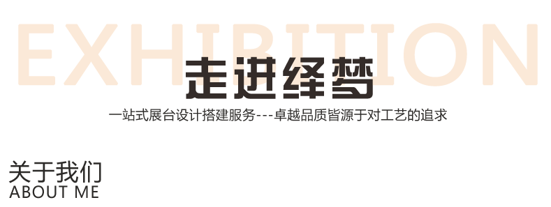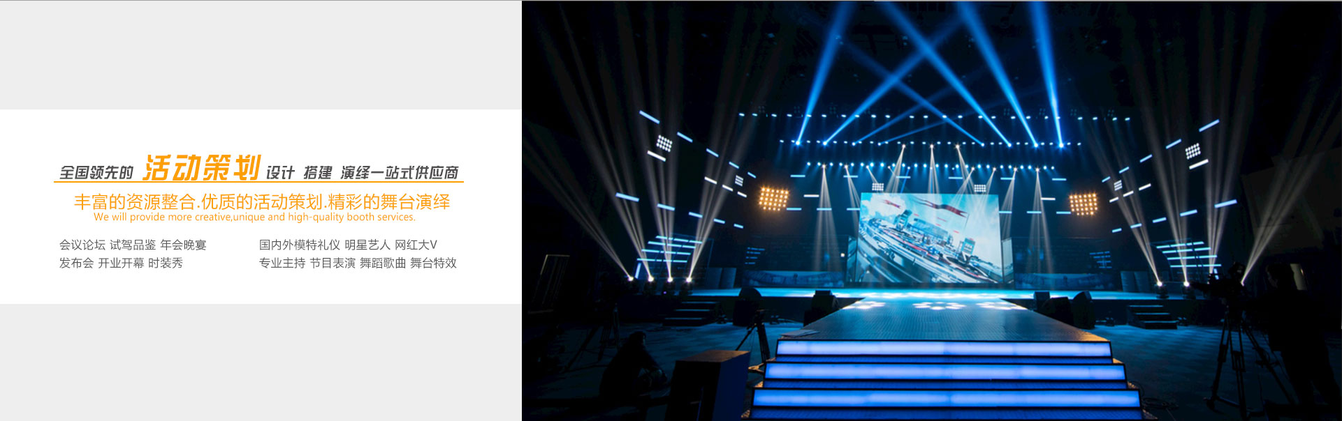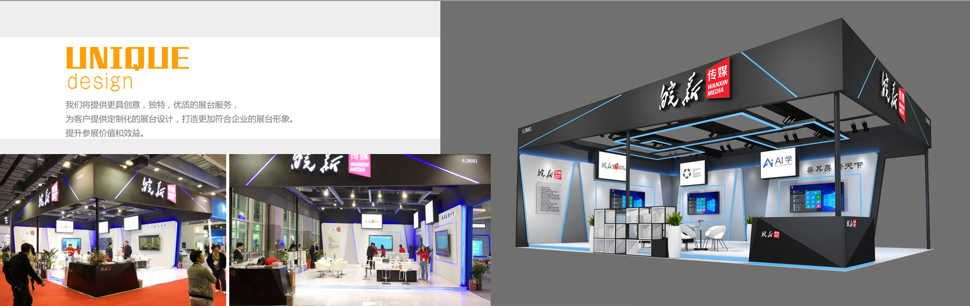 公司秉承“誠信為本,質量為源,服務優先”的經營理念,讓藝術與企業發展同行,全心筑就精品展臺,公司現擁有一批實力資深的設計團隊及精湛的施工隊伍,能為你提供全國各地會展城市展會策劃設計和展臺布置搭建,巡展倉儲的全國一站式服務。